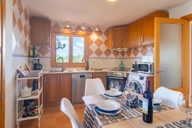 Für die Selbstversorgung im Urlaub bietet Euch die gut ausgestattete Küche alle notwendigen Geräte. Neben einem Backofen, Herd, Mikrowelle, Geschirrspüler, Kühl- und Gefrierschrank stehen Euch auch kleinere Geräte wie Toaster, Kaffeemaschine und Wasserkocher zur Verfügung. Am Esstisch nehmt Ihr Platz und genießt den Blick zur kleinen Zitrusplantage vor dem Küchenfenster. Als praktisch beim Tischdecken im Freien erweist sich der direkte Zugang von hier.