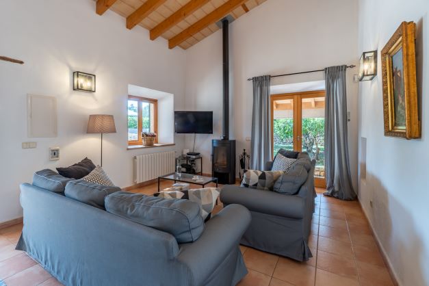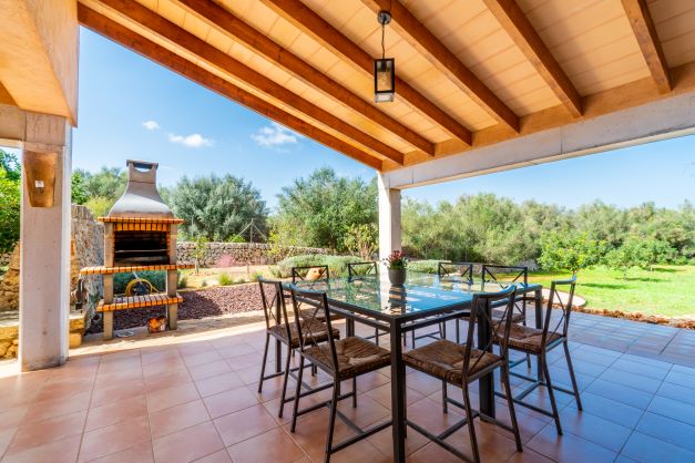 Sowohl von der Küche, als auch vom Wohnzimmer erreicht Ihr die beiden großzügig angelegten Terrassen. Esstisch und Stühle sowie ein gemauerter Grill erwarten Euch auf der Terrasse an der Küchenseite. Dank der kurzen Wegstrecke erledigt Ihr das Decken des Tisches im Handumdrehen. Einfach ein herrliches Plätzchen für den ersten Kaffee am Morgen mit Blick auf die ländliche Umgebung und das Tramuntana Gebirge. Im Mai und Oktober, wenn die Orangen reif sind, dürft Ihr Euch gerne an den Bäumen bedienen.